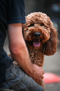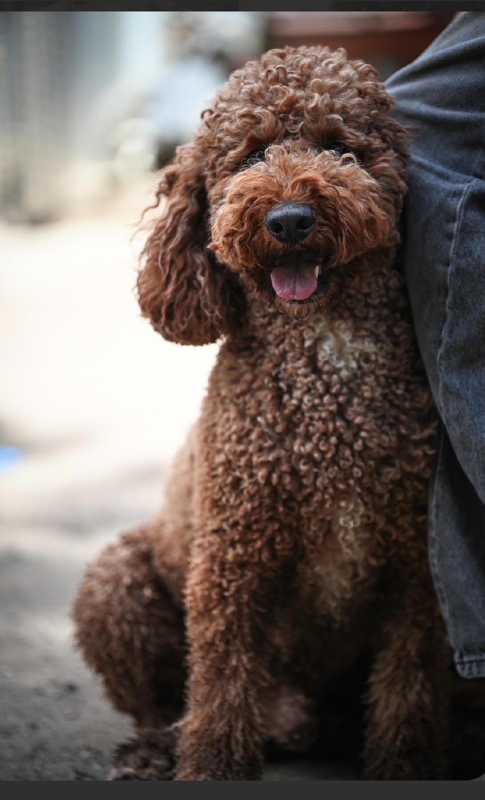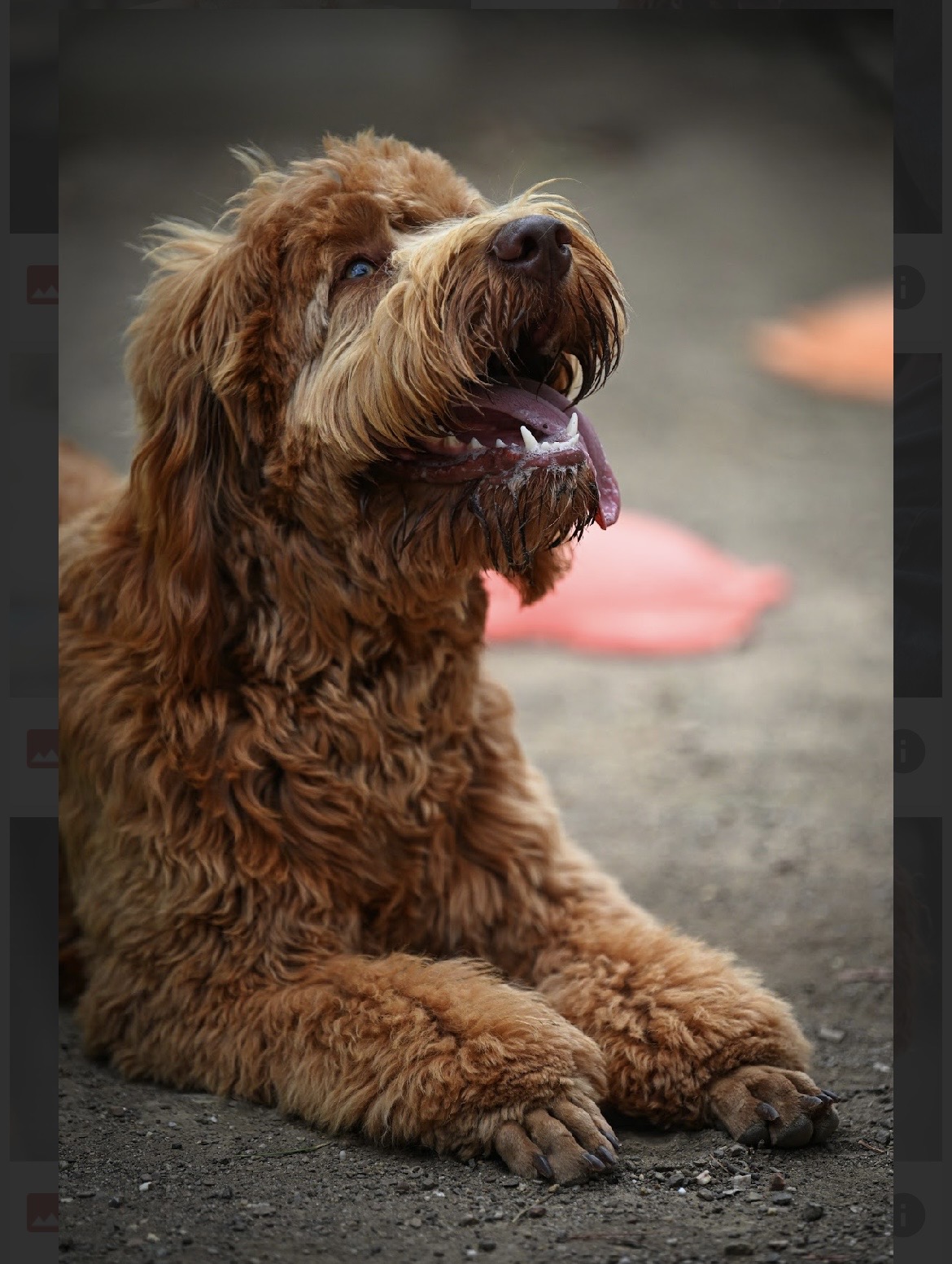 Syrup is a highly intelligent Moyen Poodle. He is such a sweet natured boy and is very friendly around all of our dogs. He is DNA and has a certificate from a canine ophthalmologist confirming he is clear of PRA. Syrup will be the father of F1 and F1b Groodles. Syrup is such a goof. He is so happy and loves to look into your eyes. He just loves life!!